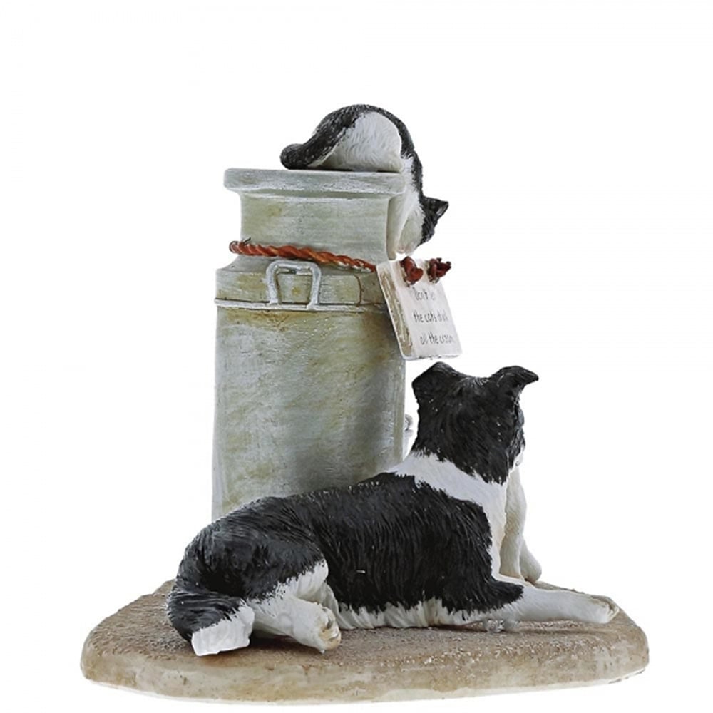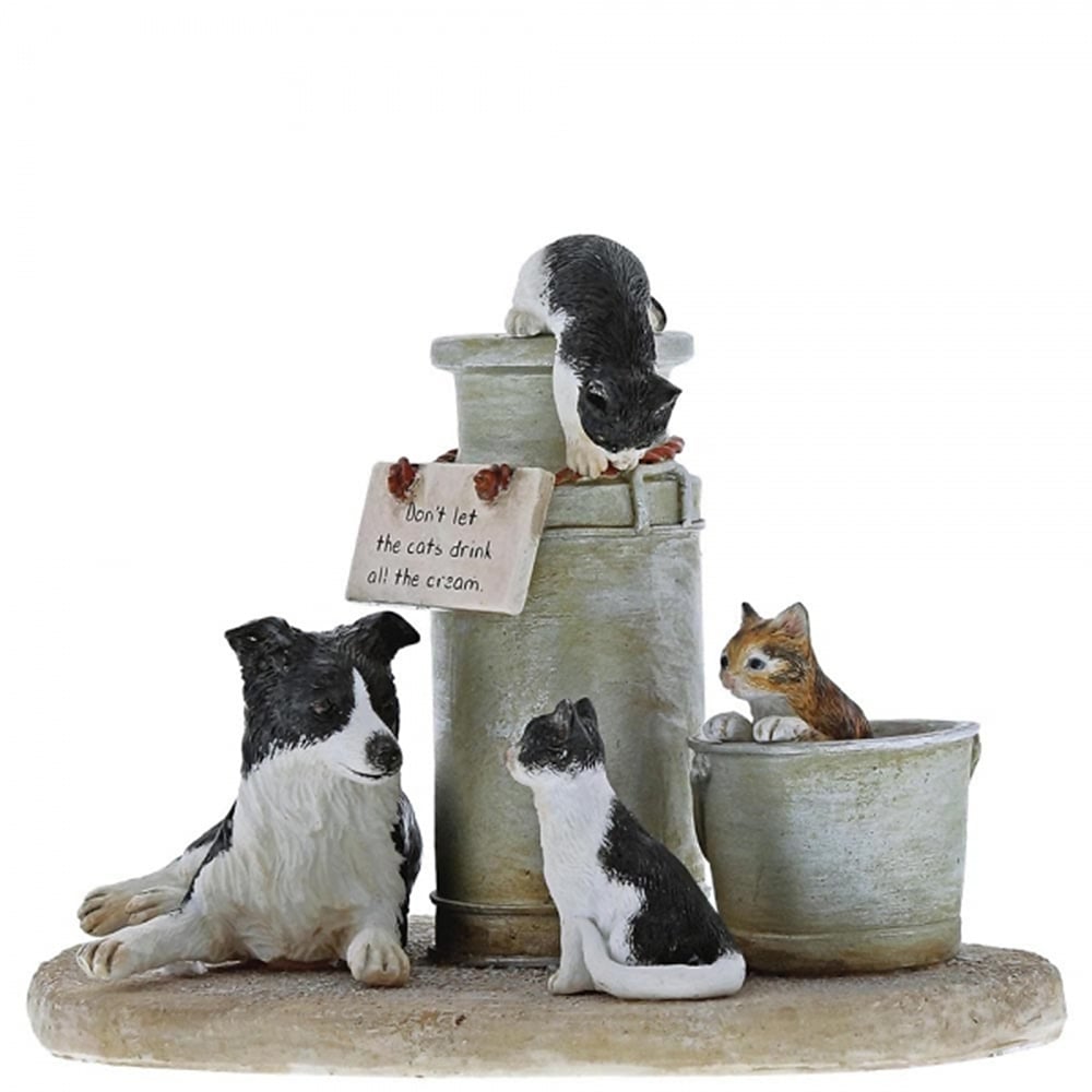 This 'Cats That Got The Cream' figurine shows three cheeky cats sneaking some cream, being watched by the loyal Border Collie .