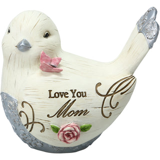 Love you Mom bird figurine, packaged in a printed box, is made from polyresin.