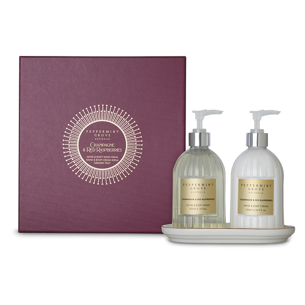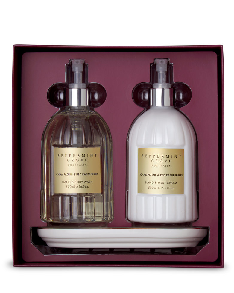 Featuring our signature Hand & Body Wash and Hand & Body Cream 500ml in our limited edition Champagne & Red Raspberries fragrance.