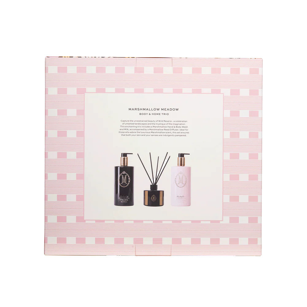 This enchanting trio includes a Marshmallow Hand & Body Wash and Milk, accompanied by a Marshmallow Reed Diffuser.